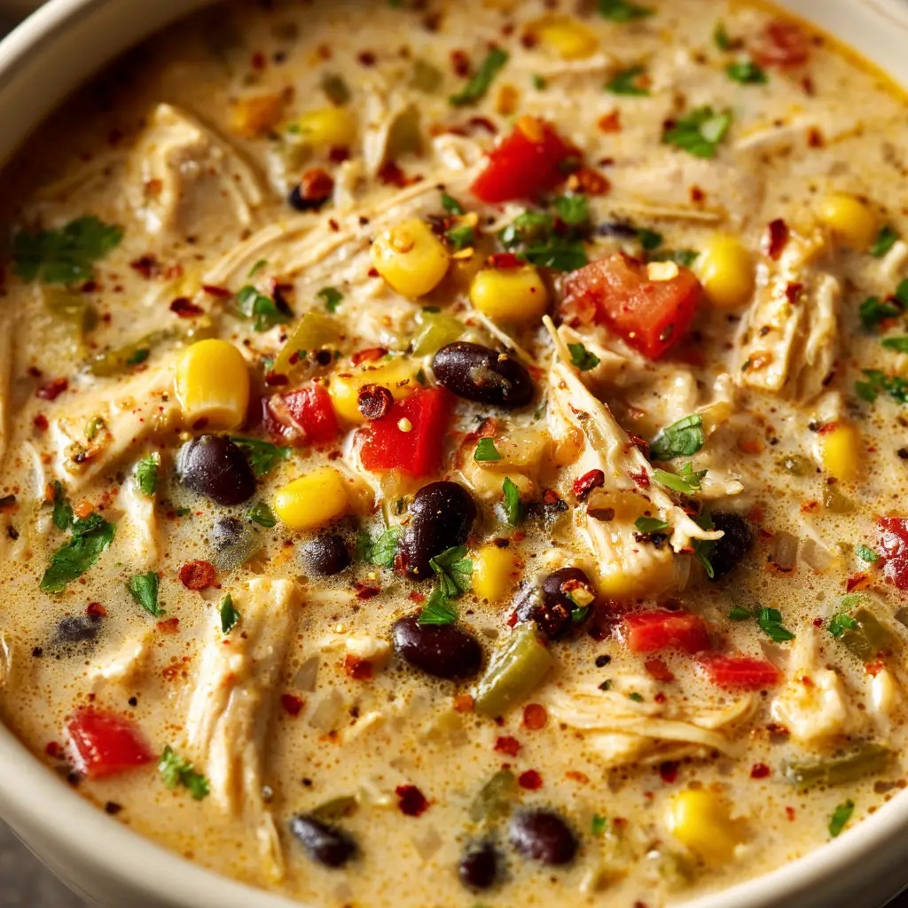 A close-up, top-down view of a bowl of creamy chicken tortilla soup, showcasing the texture of the shredded chicken, corn, and beans.