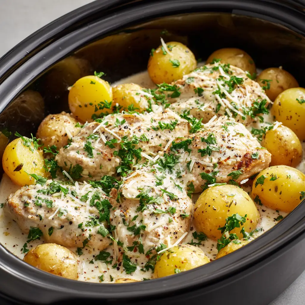 Imagine coming home to the incredible aroma of garlic and herbs filling your space. Inside your slow cooker, you’ll find whole chicken breasts and golden baby potatoes, all generously smothered in a glossy, rich white cream sauce. It’s a dish that looks as amazing as it tastes, finished with a vibrant shower of fresh parsley, sharp parmesan, and a kick of black pepper. This is the meal that gets rave reviews every single time.