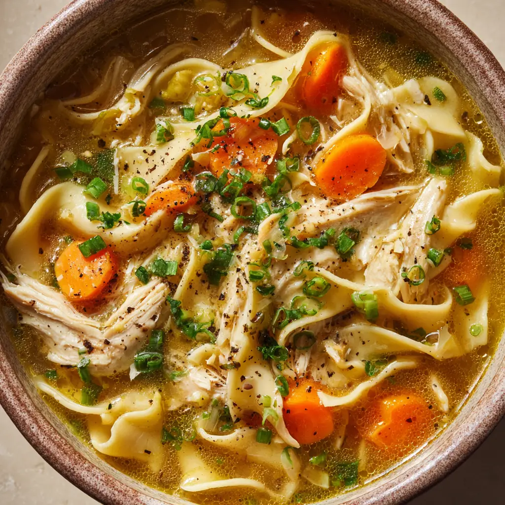 To serve, ladle the soup generously into rustic bowls. Ensure you get a good mix of the golden broth, thick noodles, shredded chicken, and carrots. Garnish heavily with the freshly chopped scallions and a light dusting of coarse black pepper. Serve immediately.