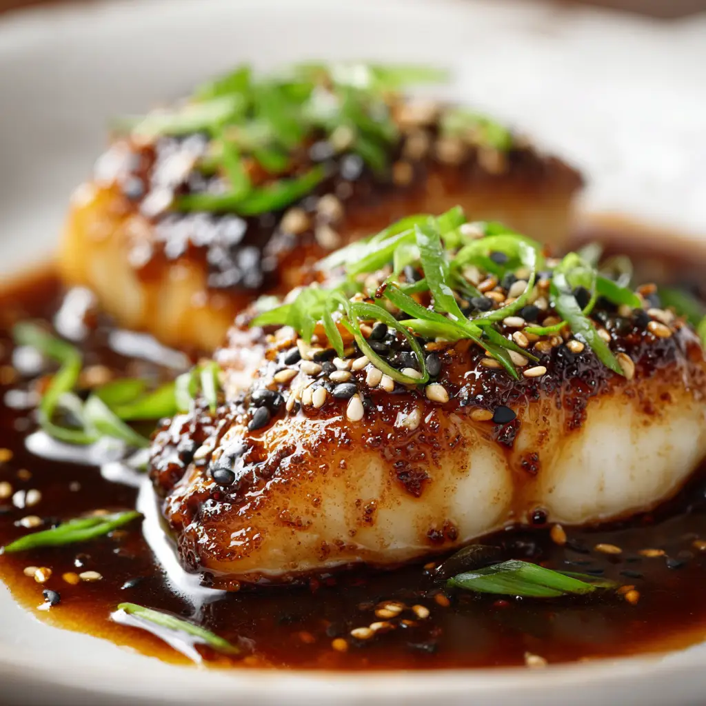 - Glaze and Serve: Reduce the heat to low. Pour the ginger soy glaze over the cod fillets in the pan. Let it bubble and thicken for about 1-2 minutes, spooning the glaze over the fish. Serve immediately, garnished with sesame seeds and green onions.