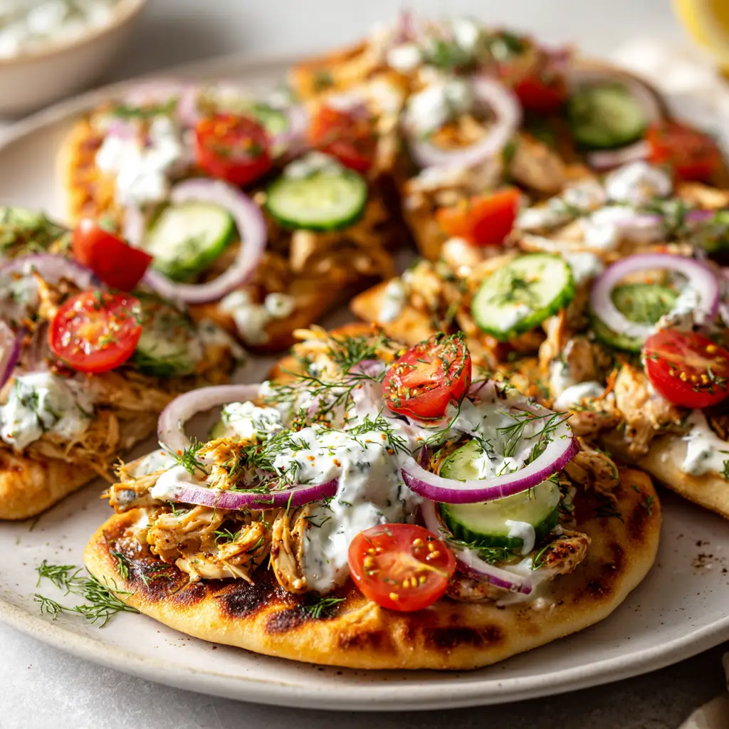 - Garnish and Serve: While the pizza bakes, quickly mix the Greek yogurt, lemon juice, dill, and minced garlic for the tzatziki drizzle. Once the pizzas are out of the oven, let them cool for a minute before drizzling with the tzatziki sauce. Slice and serve immediately!