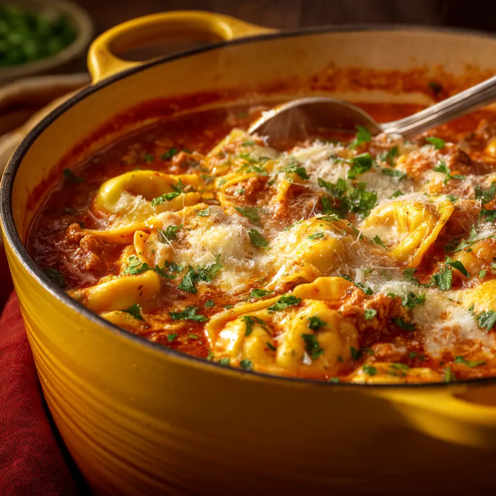 Cooked perfectly in a rustic yellow dutch oven, this visually stunning dish is loaded with savory ground sausage and tender pillows of cheese tortellini. Every spoonful delivers a hearty, deeply satisfying bite that warms you from the inside out.